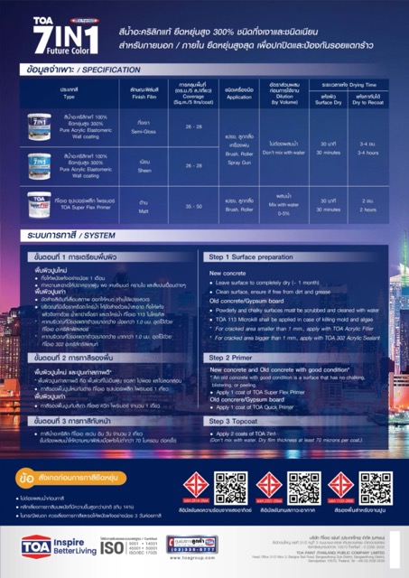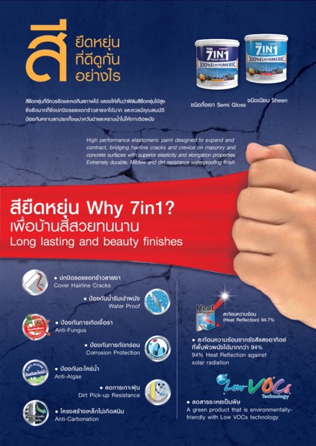 สีน้ำอะคริลิกแท้ คุณสมบัติโดดเด่น ยืดหยุ่นสูง 300% ปกป้องบ้านของคุณจากทุกปัญหา แก้ปัญหาบ้านร้าว แตกลายงา จากปูนหดตัว หรือบ้านทรุดตัว ปกปิดทุกรอยแตกร้าว เนียนเหมือนบ้านใหม่ ทั้งยังเพิ่มประสิทธิภาพด้วย Protective Hybrid Technology สุดยอดเทคโนโลยีจากเยอรมัน ผสานคุณสมบัติลดการเกาะติดของคราบสกปรกน้ำและน้ำมัน ไว้ในสียืดหยุ่นสูง ทีโอเอ เซเว่น อิน วัน