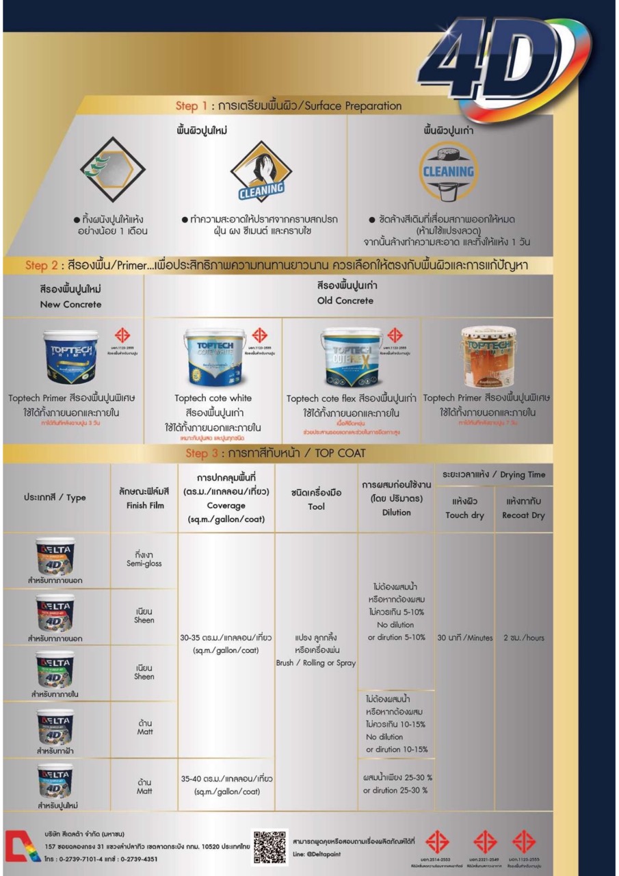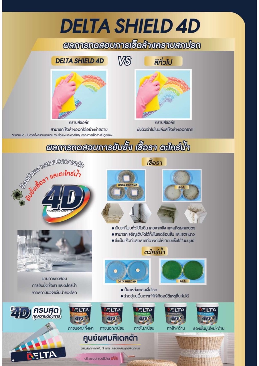 นวัตกรรมที่ผ่านการคิดค้นจาก DELTA QUALITY LAB สีทับหน้า เดลต้าชิลด์ โฟว์ดี มีผงสีคุณภาพพิเศษ ผลิตจากอะคริลิคแท้ 100% ให้คุณสมบัติที่ทนความเป็นด่างได้ดี ป้องกันเชื้อรา และตะไคร่น้ำ ฟิล์มสีทนทาน ด้วยคุณสมบัติ D Cross Bonding ฟิล์มสีเรียงตัวกันอย่างเหนียวแน่น ระดับนาโน ช่วยเสริมการยึดเกาะได้เป็นอย่างดี อีกทั้งยังสามารถกลบมิดพื้นผิวได้ดีเยี่ยม กลิ่นอ่อน ไม่เป็นอันตรายต่อระบบทางเดินหายใจ ทนทานสูงสุด 10 ปี สะท้อนความร้อนได้สูงสุด 95%