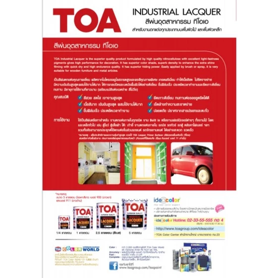 สีพ่นอุตสาหกรรม TOA Industrial LACQUER ผ่านกระบวนการผลิตเฉพาะ จากวัสดุไนโตรเซลลูโลสูเรซิน และผงสีชนิดพิเศษทำให้ฟิล์มสีมีความคงทน สีสันสดใส กลบพื้นผิวได้เยี่ยม สามารถใช้ได้กับพื้นผิวต่าง ๆ เช่น ไม้อัด, ไม้ MDF, ไม้จริง และพื้นผิวเหล็ก เป็นต้น
