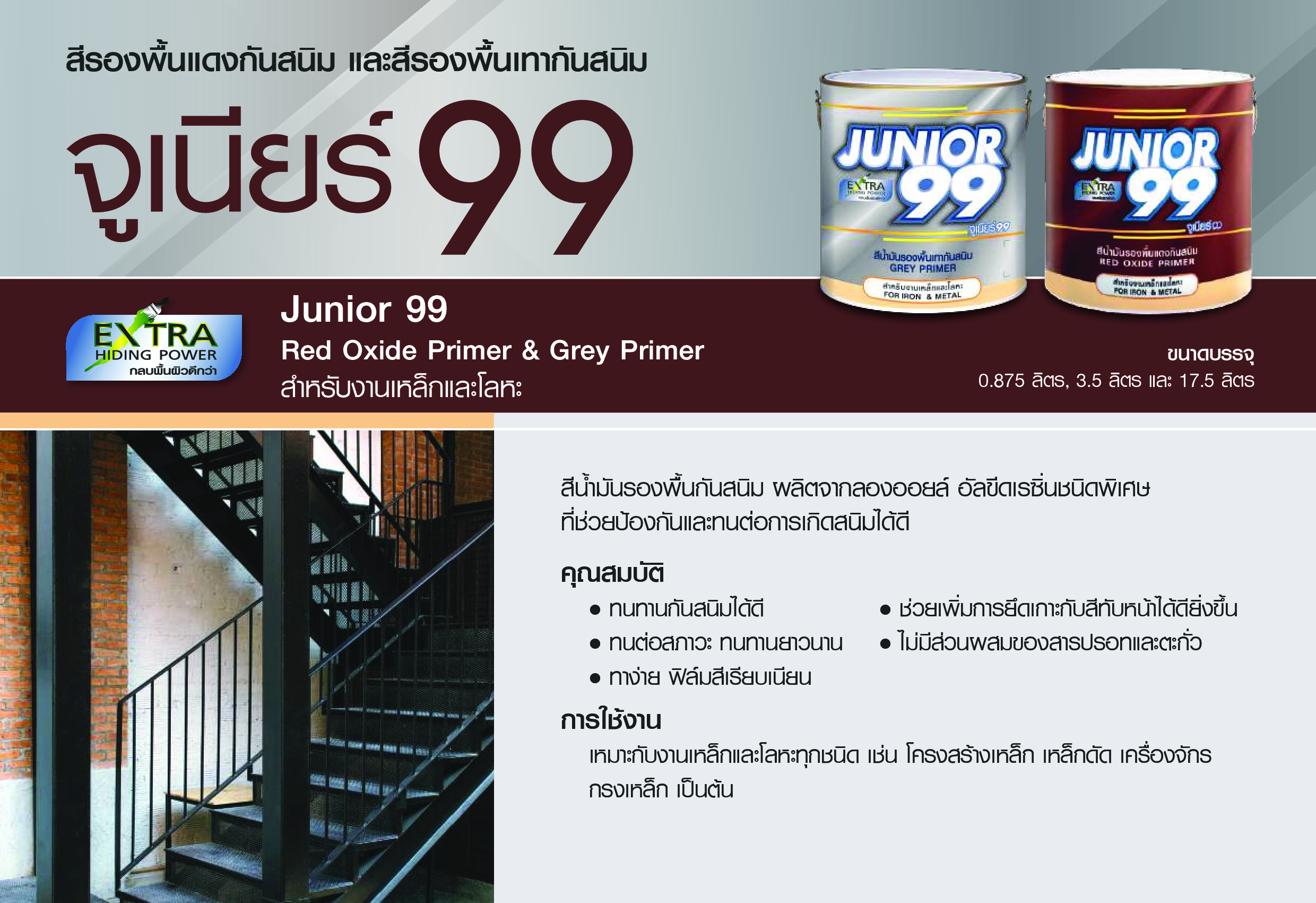 สีรองพื้นเทากันสนิมสำหรับเหล็ก ผสมผงซิงค์ฟอสเฟต คุณภาพดี ช่วยป้องกันสนิม ยึดเกาะกับพื้นผิวเหล็กและสีทับหน้าได้ดี