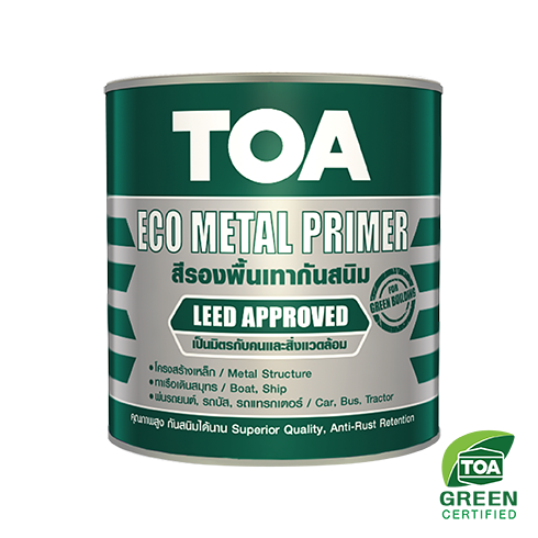 สีรองพื้นกันสนิม ทีโอเอ อีโค เมทัล ไพร์เมอร์ เป็นแอลคีดชนิดพิเศษมีเนื้อสีมาก มีสารอินทรีย์ที่ระเหยง่ายในปริมาณต่ำ จึงไม่ทำลายสิ่งแวดล้อม มีผงกันสนิมชนิดพิเศษที่มีประสิทธิภาพสูง สามารถยึดเกาะได้ดีบนพื้นผิวโลหะ ไม่มีส่วนประกอบที่เป็นอันตรายของโลหะหนัก เช่น ตะกั่ว, ปรอท, แคดเมียม และโครเมียม ใช้งานง่าย สามารถใช้เป็นสีรองพื้นทั้งงานใหม่ และซ่อมโครงสร้างของงาน สะพาน ถัง หรือ เครื่องจักรได้