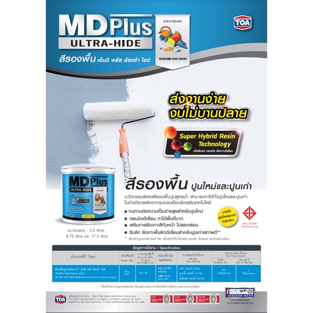 รองพื้นปูนใหม่และเก่าสูตรน้ำ ทีโอเอเป็ดหงส์อัลตร้าไฮด์ TOA MD Plus Ultra Hide สีขาว